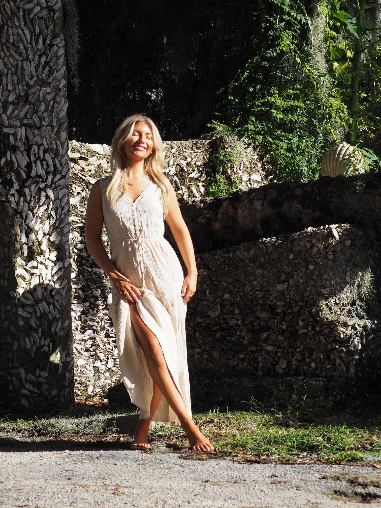 This tan flowy dress embodies effortless beauty with its delicate button details and elegant V-neckline. Made from airy, lightweight fabric, it drapes gracefully for a soft, feminine silhouette. Its casual design ensures comfort while maintaining a chic, refined look perfect for warm, sunny days.