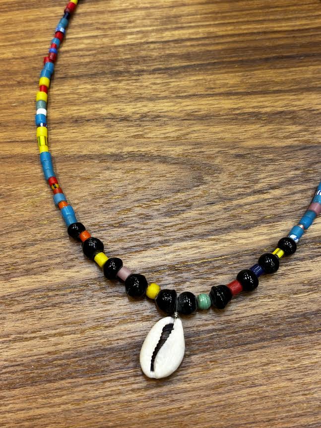 This multicolor bead necklace features a vibrant rainbow palette with a striking black cowrie shell centerpiece. Its cheerful colors and unique shell detail add a playful, beachy vibe to any outfit, making it perfect for casual days and summer adventures. Lightweight and colorful, it’s an easy way to brighten your look.