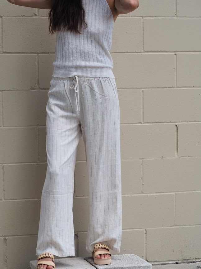 These cream pinstriped linen pants bring a breezy, beachy vibe to your wardrobe. Lightweight and breathable, they’re perfect for sunny days by the shore or casual strolls. The subtle stripes add a touch of playful sophistication, making them easy to dress up or down for any laid-back occasion.